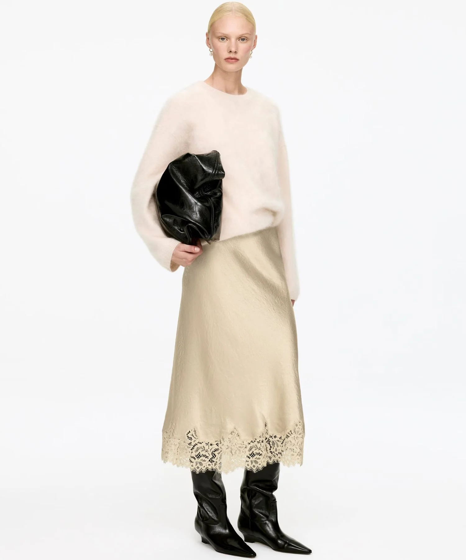 Midi skirts, cardigans, crisp shirts and knee-high boots are being styled together with playful proportions.
