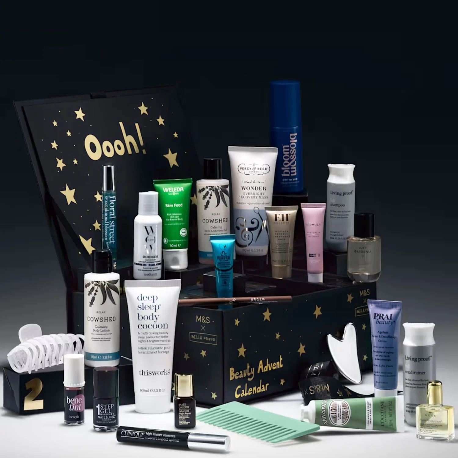 Unwrap skincare heroes from Prai, Estée Lauder, and Emma Hardie, discover radiant haircare from Living Proof, Percy & Reed, and Color Wow, and indulge in pampering essentials from Bloom & Blossom, This Works, Nuxe, Weleda, and Cowshed. Get party-ready with makeup must-haves from Clinique, Stila, and Benefit, then finish with the soft floral notes of Floral Street and Discover Soft Gardenia.