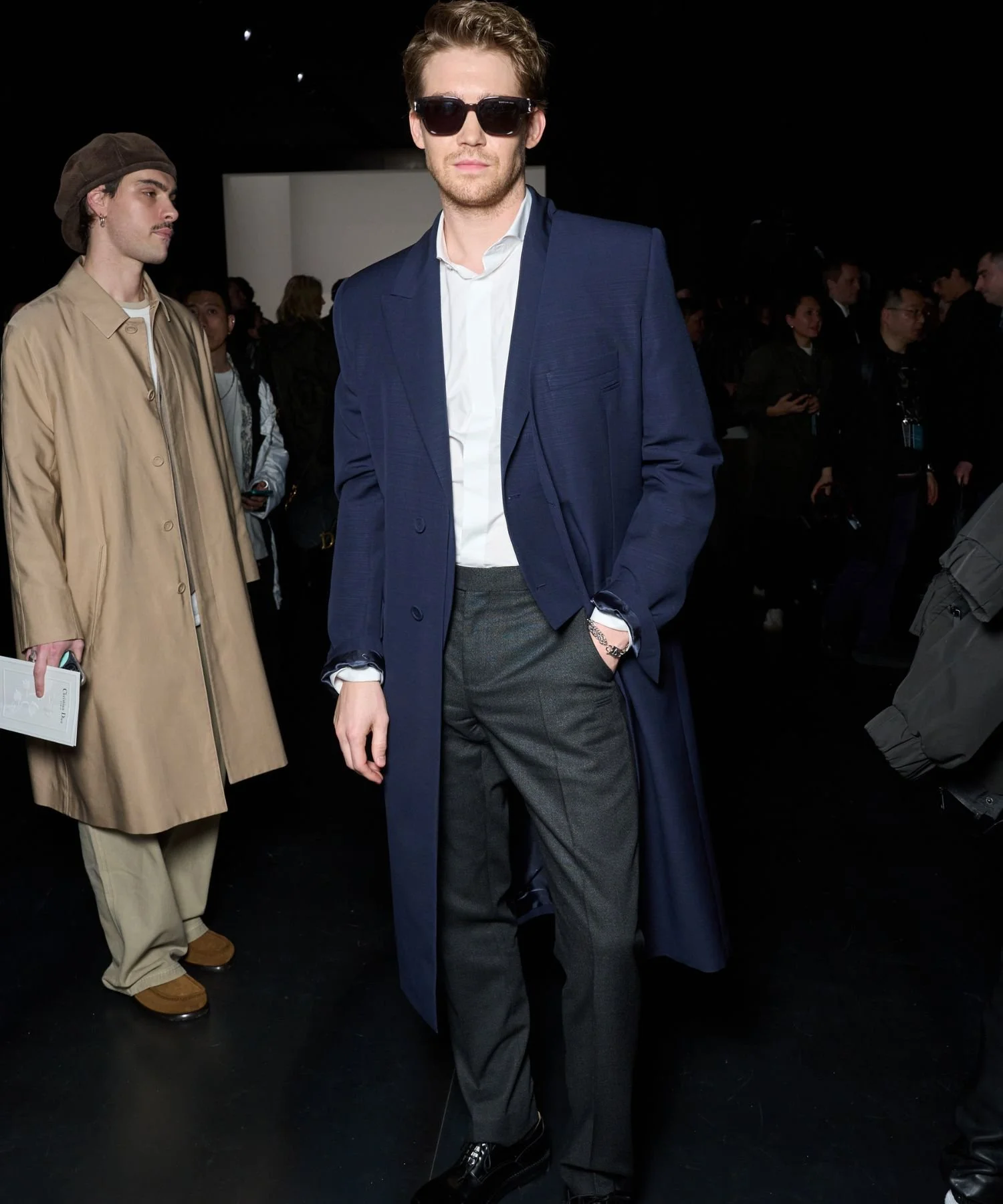 Navy overcoat, navy knit, grey trousers, black lace ups.