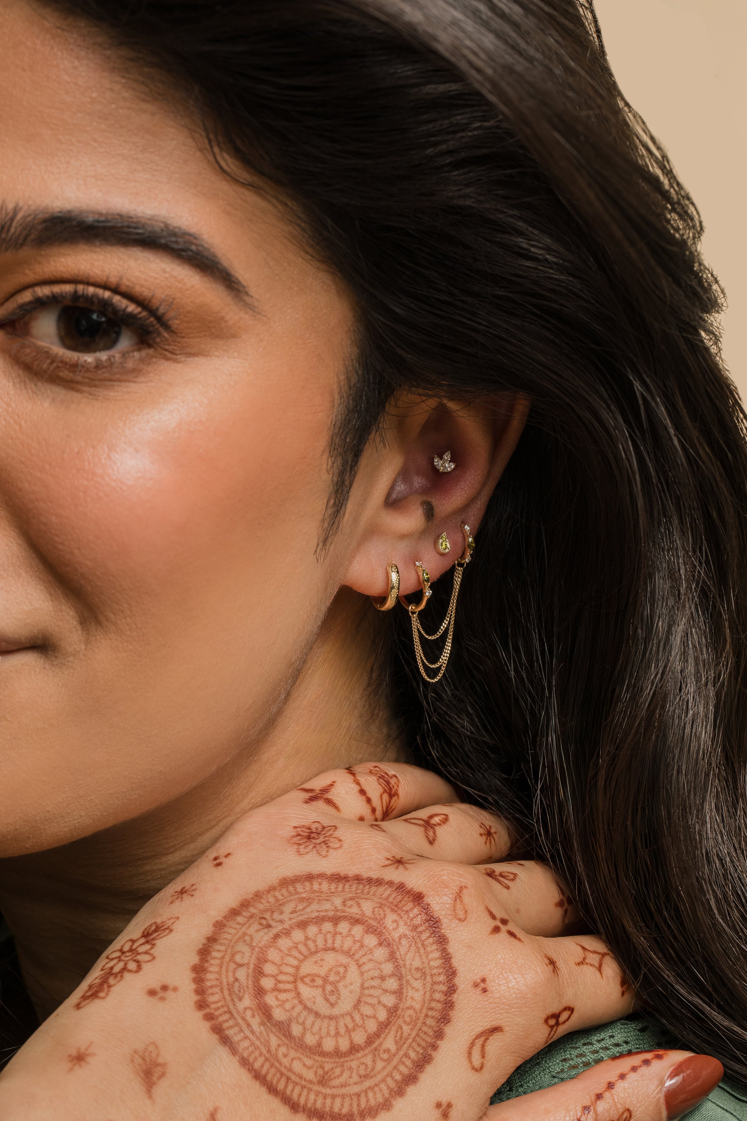 That cultural weight runs through the entire collection. The motifs are familiar, flowing curves, florals and paisley shapes typically traced across hands and wrists, now rendered in solid gold. Studs, small hoops and delicate drops are designed to layer easily, building a look that feels individual rather than prescribed.