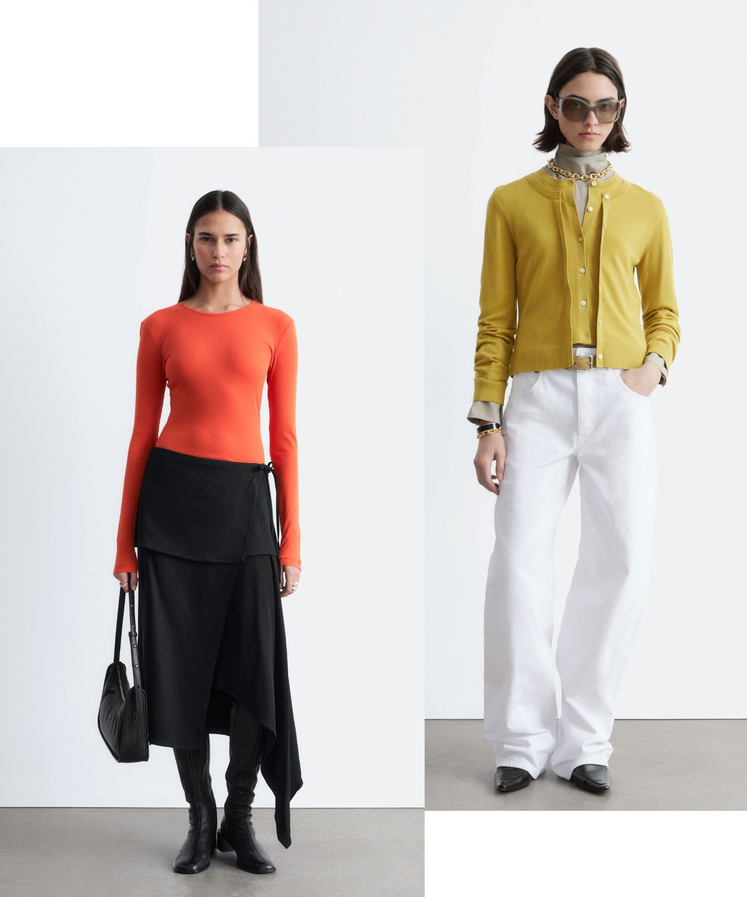 Cream, black, tan, chocolate. Onto that, feel liberated to add one decisive colour. A saturated red knit against inky tailoring. Cobalt worn simply with black. A coral skirt that shifts the mood entirely. Even chartreuse, in fine knit, feels informed when grounded properly.