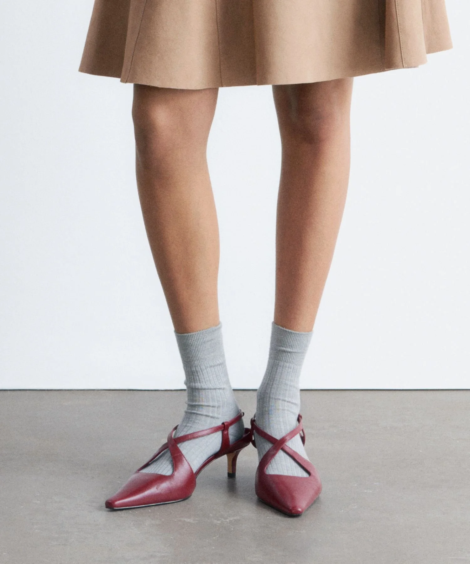 Knee high black leather boots ground midis and shirt dresses. Cream ballet flats lighten tailoring. A low sculpted heel with a delicate strap adds shape without sacrificing comfort. Trainers are slimmer now, closer to the foot, borrowing from ballet and Mary Jane silhouettes rather than bulky sport styles.